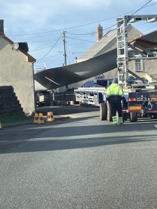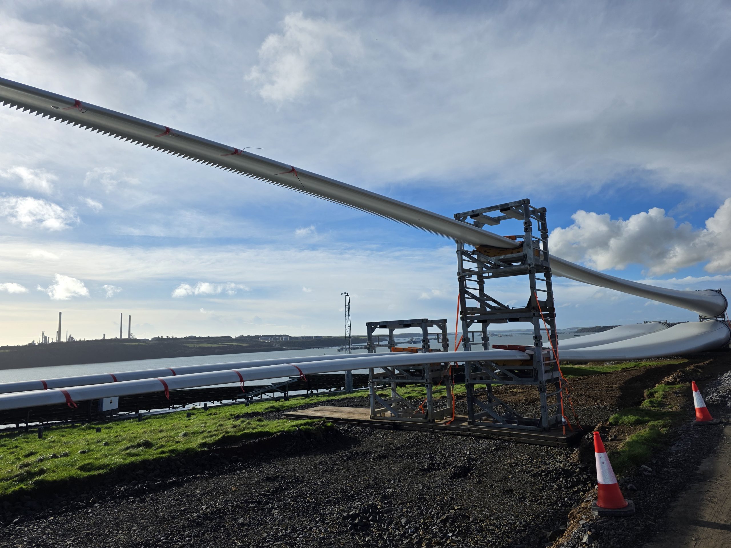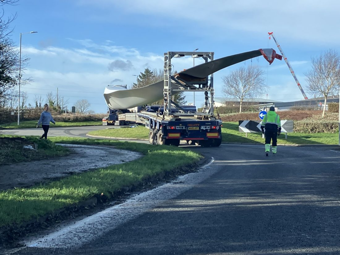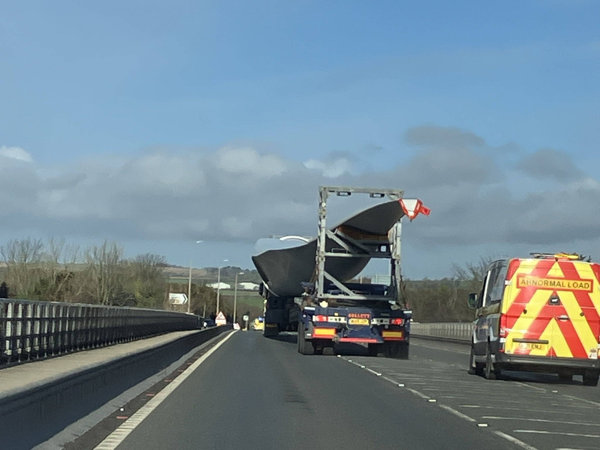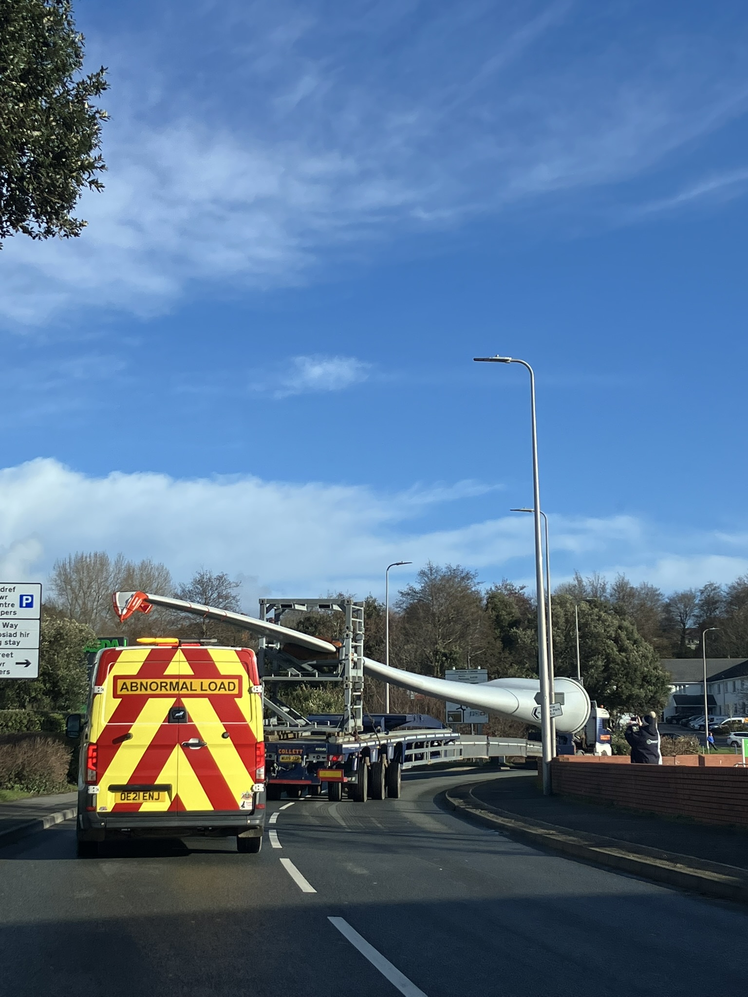 The project comprises the installation of three Enercon E138EP3 turbines located in “keyholes” left for the purpose within an existing solar farm which added to the challenge. We were very pleased to take the opportunity to meet our friends from Enercon at Pembroke Dock where the turbine components were stored pending delivery to the site. Enercon’s negotiations the police and the transport company resulted in Jaime Silva and three other members of our wind farm development team travelling the short distance from Pembroke Dock to Milford Haven within the police convoy which is rarely permitted. Photographs attached show some of the highlights along the route.